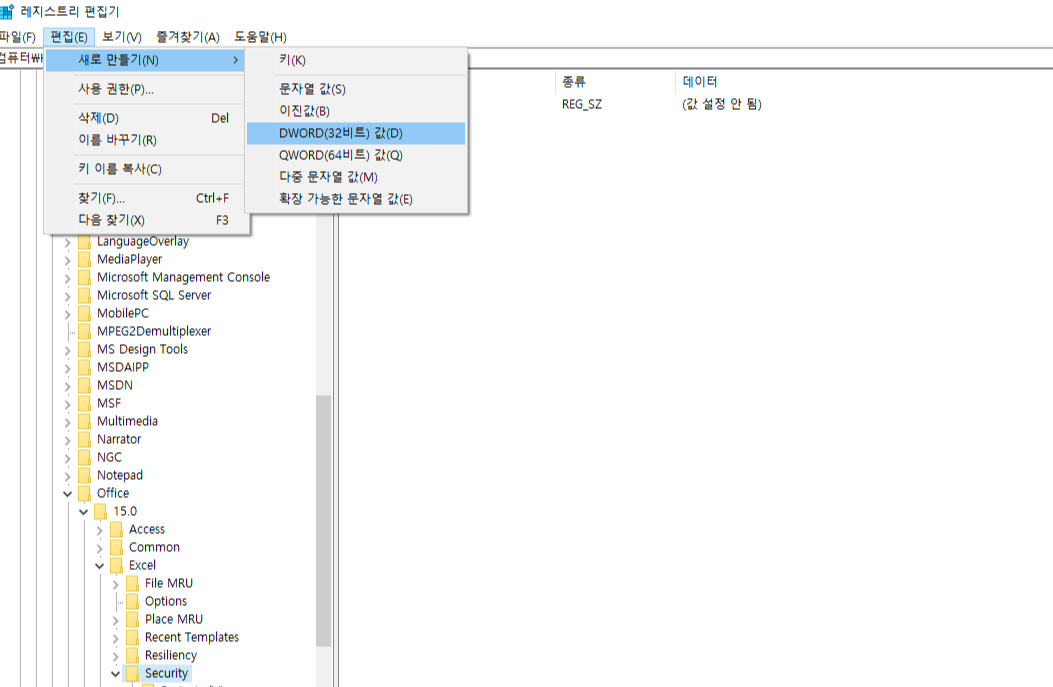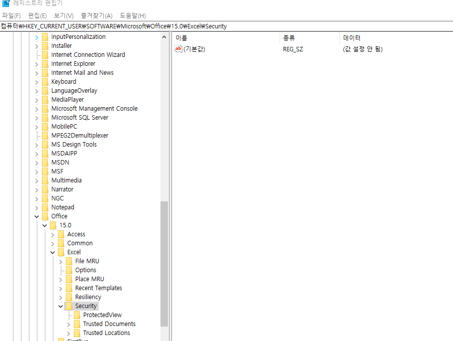 2. HKEY_CURRENT_USER ▶ SOFTWARE ▶ Microsoft ▶ 숫자로 된 버전 ▶ Excel ▶ Security