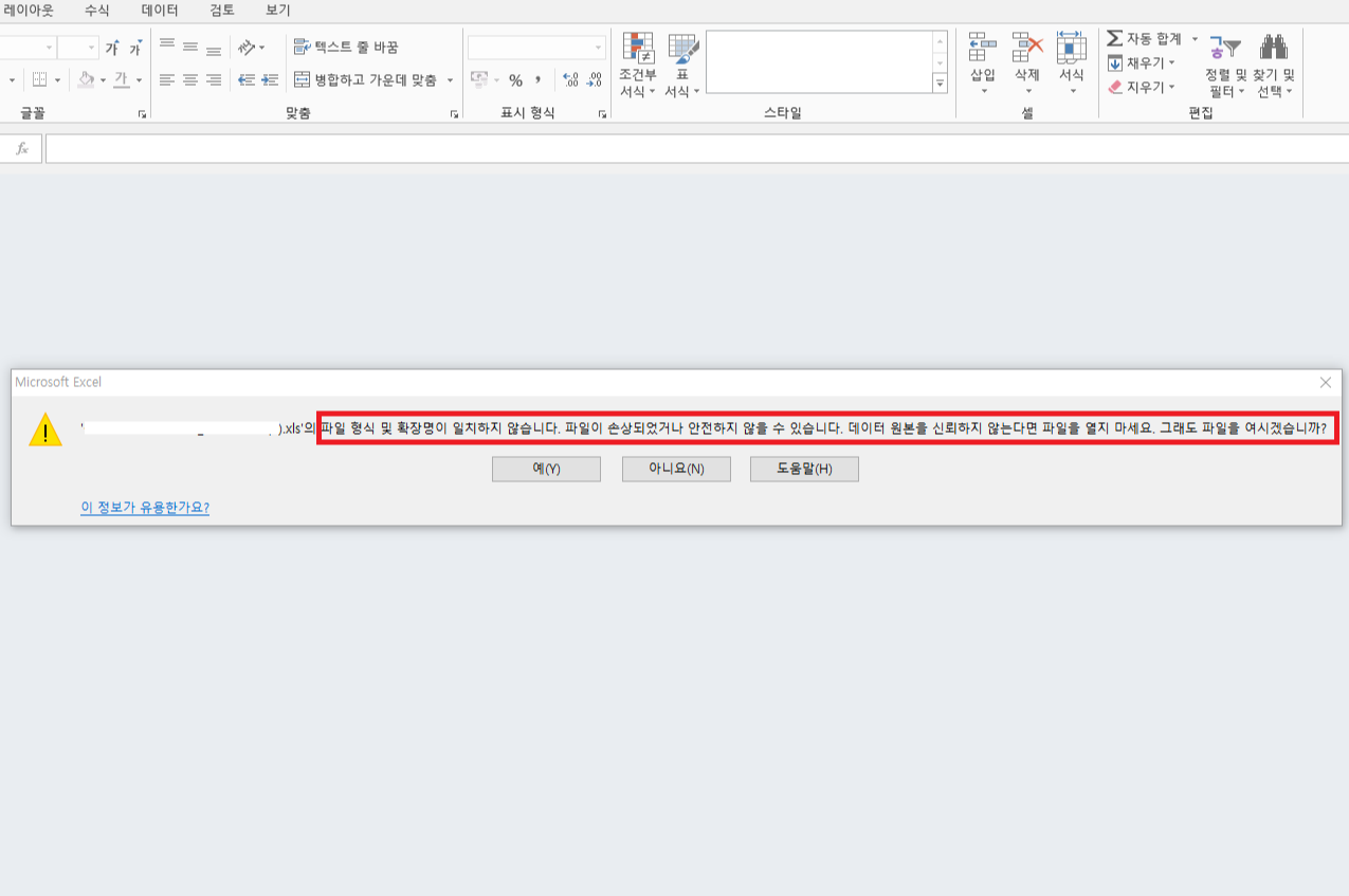 그동안 엑셀을 열 때마다 뜨는 경고를 별생각 없이 무시한 채 사용해 왔었다.
