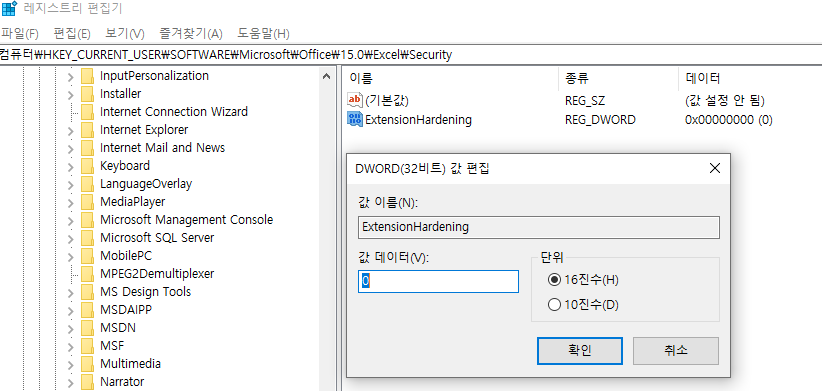* 값 데이터 0 : 파일 이름 확장명과 파일 형식을 검사하지 않고, 경고 메시지 기능을 무시