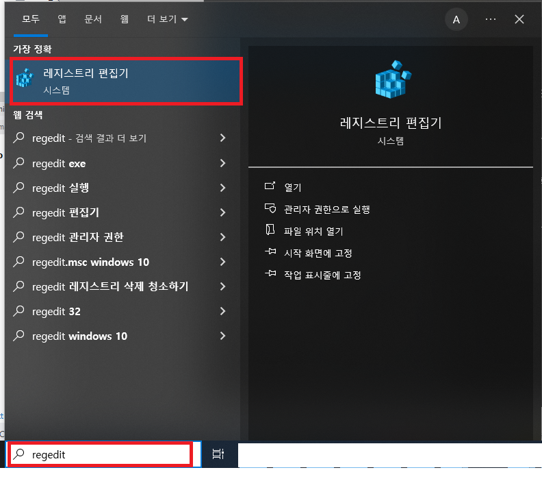1. 윈도우 검색창에 regedit 입력 레지스트리 편집기 클릭